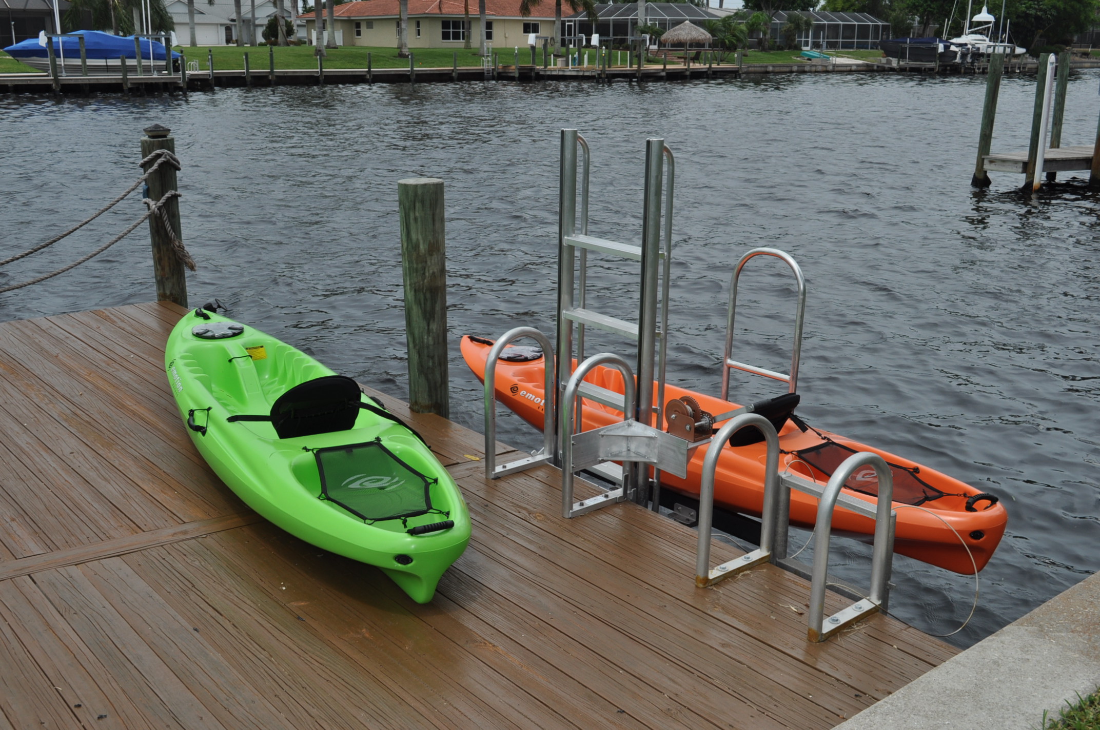 For a number of months, I was looking for an easy way to safely launch my kayak on the canal behind my house. Since there was a seawall in place, there was no ramp or beach from which to launch, and I need to have the kayaks stable when getting in and out. My dock was too high to use, and the dock ladder didn’t provide proper access either. I needed to add something to the dock or seawall to hold the kayak steady for entry and exit.